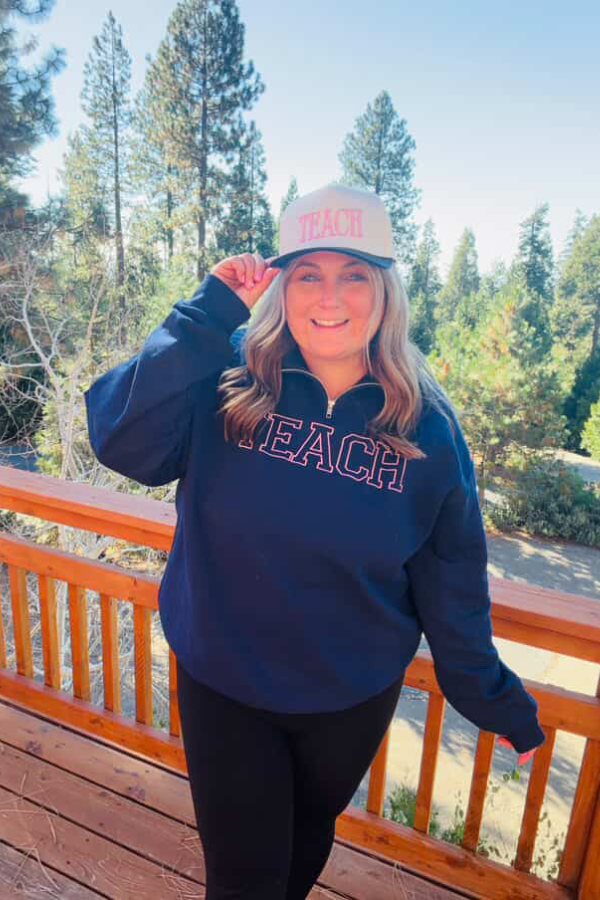 Featuring bold puff embroidery, this hat adds a modern, textured look that stands out without being too loud. Lightweight, comfortable, and effortlessly cute, it pairs perfectly with teacher tees, crewnecks, weekend outfits, or casual Fridays at school.